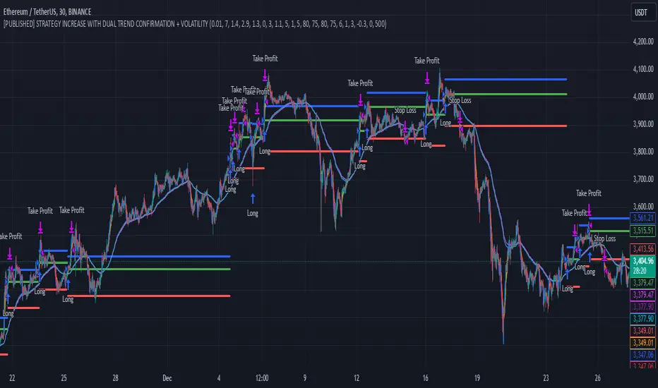 The script does not rely on any public scripts or indicators. Apart the EMA, all the underlying logic, including the volatility thresholds and filtering mechanisms, has been custom developed to ensure originality and precision. The strategy's conditions are all configurable by the user in the TradingView pop-up, allowing it to adapt to different assets and timeframes. For example, users can set the EMA lengths to align with long-term trends for cryptocurrencies or adjust volatility thresholds to account for the specific price movement behavior of stocks or forex pairs.