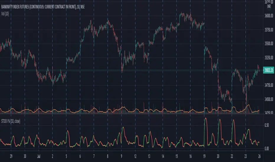 This indicator plots Standard Deviation in Percentage. Standard deviation depicts how far is price from its mean.