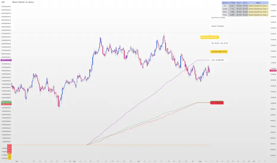 On-Chart Labels: Show total volume, buy/sell volumes, Long/Short Ratio, buy/sell percentages, current method, and sensitivity.