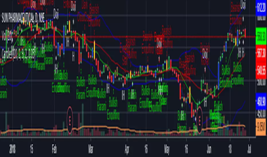 The default script has: Bollinger Bands,Simple Moving Average and Candlesticks pattern like Doji , Bearish Harami, Bullish Harami, Bearish Engulfing , Bullish Engulfing , Piercing Line, Bullish Belt, Bullish Kicker, and Bearish Kicker.