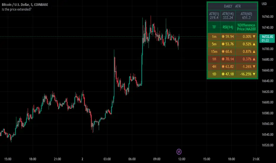 The indicator has presented as a table to show the perspective result of different indicators to help the user identify the status of the price if it’s extended or not. The table starts with the ATR section, which gives out a better look to compare the current day’s candle wide versus the average candle wide of a certain length of period that selected by the user. The second section of the table, showing RSI values at the most common upper timeframes, and the different percentages between the current price and long-term moving average entered by the user.