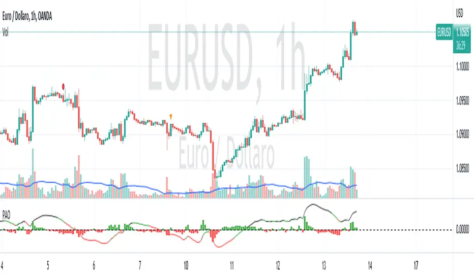 Questo oscillatore combina l'oscillatore Price Action e l'Indice di Forza Relativa (RSI) per aiutare a identificare potenziali segnali di acquisto e vendita in un mercato. L'oscillatore Price Action misura la differenza tra il prezzo di chiusura e una media mobile a 20 periodi, e poi normalizza questo valore dividendo la differenza per la deviazione standard della chiusura dalla stessa media mobile. Il risultato è un oscillatore che oscilla intorno allo zero, con valori positivi che indicano che il prezzo di chiusura è sopra la media mobile e valori negativi che indicano il contrario. L'oscillatore viene poi nuovamente normalizzato per levigare la curva.