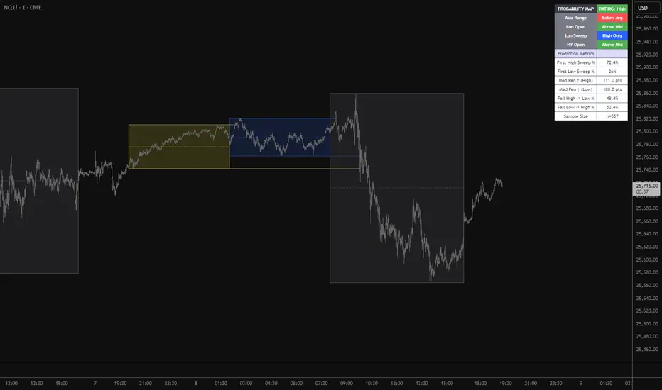 The probabilistic data is hardcoded and represents a compilation of historical session patterns from backtested or observed market behavior on NQ futures. Exact data collection methodology is not specified in the script, but values are presented as-is for illustrative purposes. Users should verify applicability to their specific symbol/timeframe, as markets evolve and past patterns may not repeat. Low-sample patterns (rated "Low") have higher uncertainty.