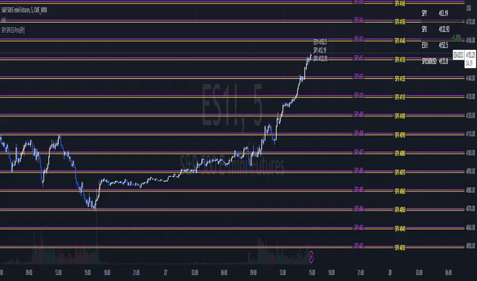 ◊ Bug fixed- Inaccurate SPY and SPX price mapping on ES chart during afterhour sessions without real time SPY / SPX price data. Script will reference 'closing' price of ES chart during regular hours for conversion.