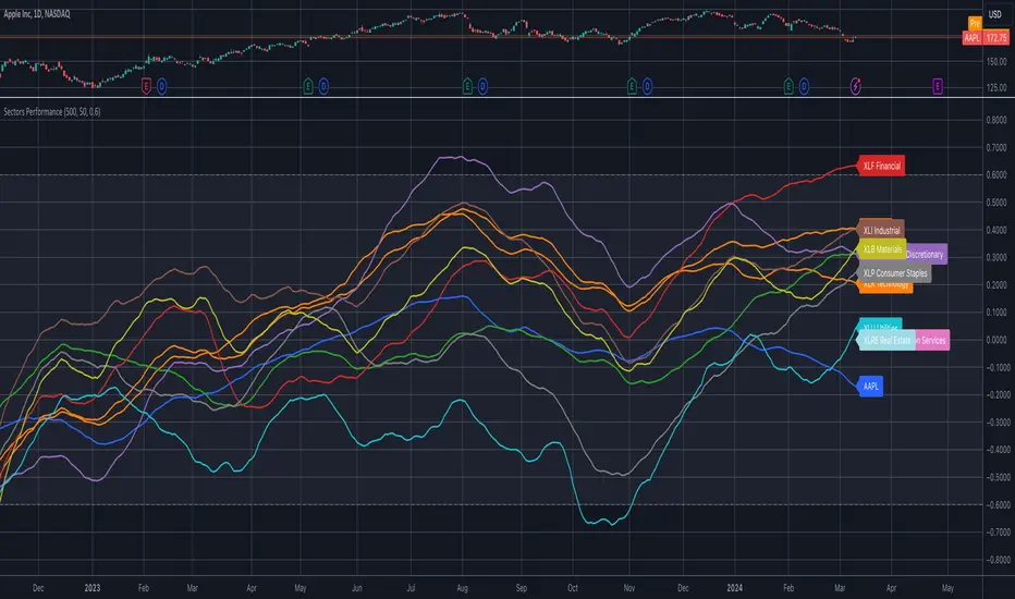 The indicator provides a nuanced view of sector performance through ETF analysis, focusing on long-term price trends and deviations from these trends to gauge relative strength or weakness. It utilizes a methodical approach to smooth out ETF price data and then applies a regression analysis to pinpoint the primary trend direction. By examining how far the current price deviates from this regression line, the indicator identifies potential overbought or oversold conditions within various sectors.