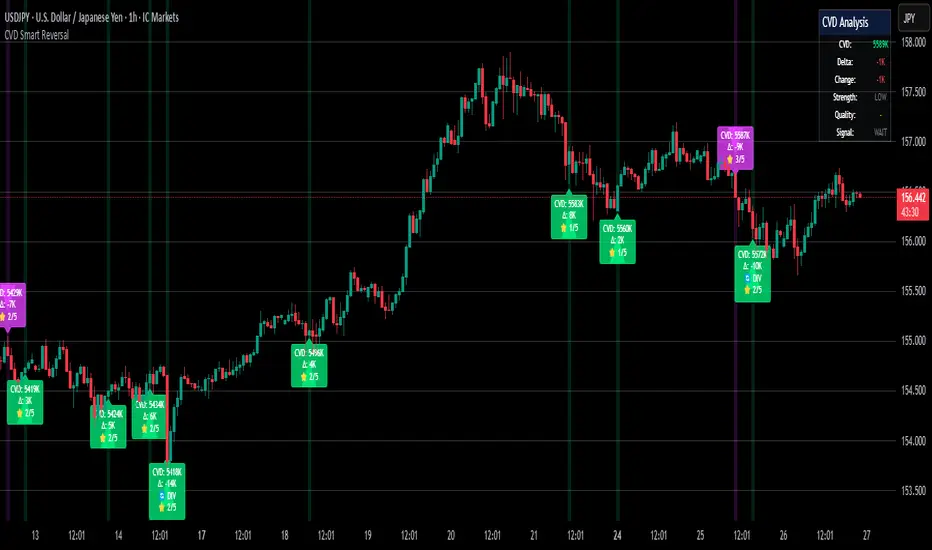 Advanced reversal detection system based on Cumulative Volume Delta (CVD) analysis with intelligent quality filtering. Each signal is rated 1-5 stars based on multiple confirmation factors.