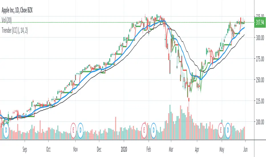 Trender is a popular trailing stop indicator on the Bloomberg system and since I didn't have source code to work with, this is a close approximation of that indicator. Let me know if you spot any discrepancies and I will adjust accordingly.