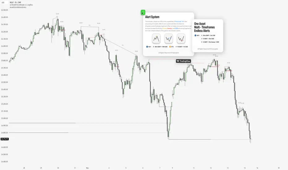 - Comprehensive Alert System: atomic alerts for individual events, preset combos for multi-confluence setups, and a custom "alert kitchen" to build your own conditions.