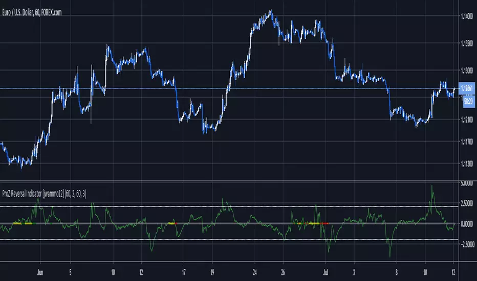 This is an indicator version of the ProZ Reversal Strategy that includes alerts for Entries, Exits, as well as the dot indicators
