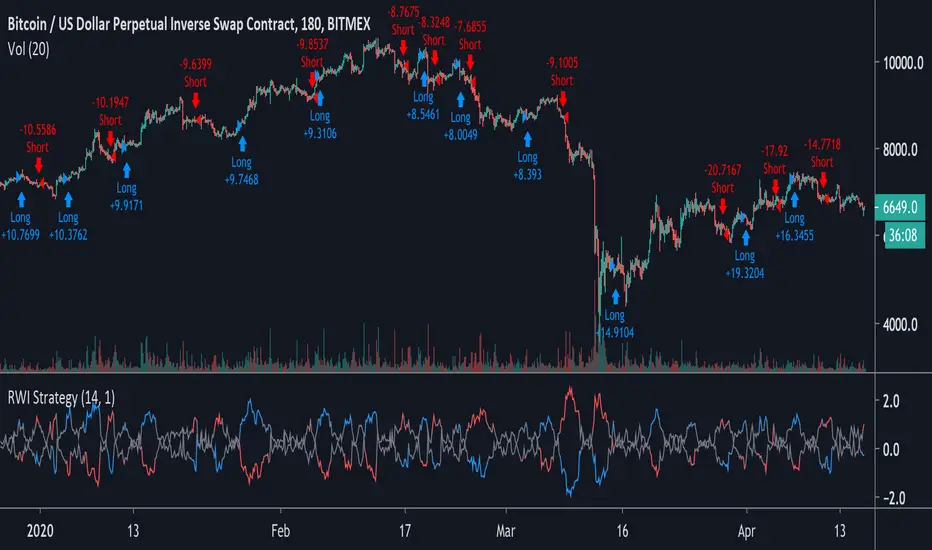 A test of the RWI used purely for long/short signals proves surprisingly profitable on 3H and 4H XBTUSD and ETHUSD.