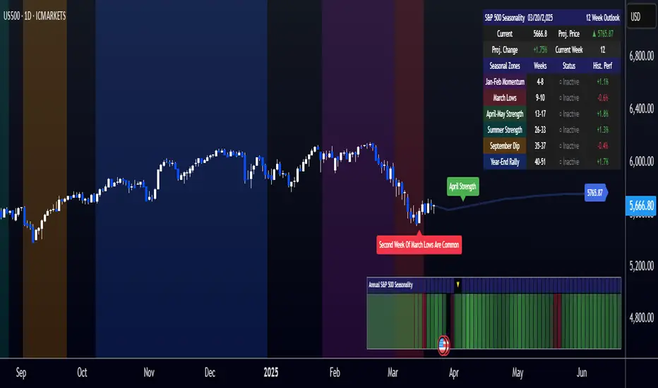 This indicator visualizes S&P 500 seasonality patterns based on historical weekly performance data. It projects price movements for up to 26 weeks ahead, highlighting key seasonal periods that have historically affected market performance.