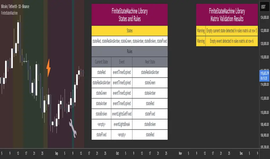 This is the first Finite State Machine library on TradingView and it's quite a different way to think about your script's logic. Advantages of using this vs hardcoding all your logic include: