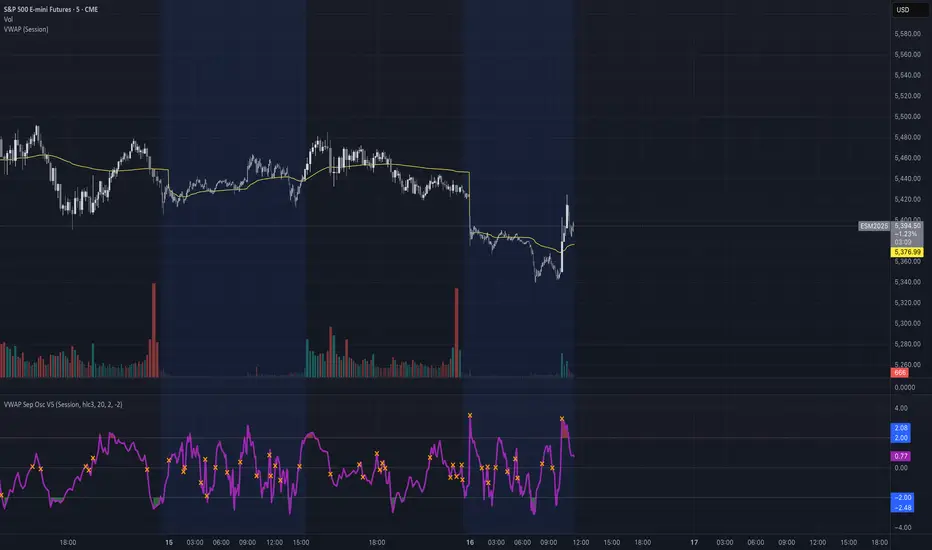 This indicator provides a normalized view of how far the current price has deviated from its Volume-Weighted Average Price (VWAP), helping traders identify potentially overbought or oversold conditions relative to recent VWAP dynamics. It calculates the price separation from VWAP and expresses it in terms of standard deviations (a Z-score), making it easier to gauge the statistical significance of the deviation.