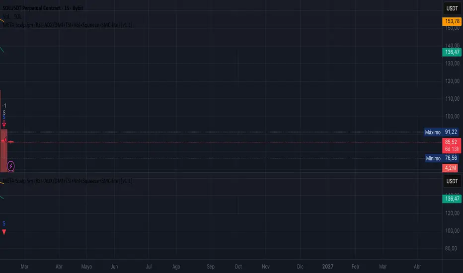 META Scalp 5m (RSI+ADX/DMI+TSI+Vol+Squeeze+SMC-lite) [v1.1] is a futures scalping strategy designed primarily for the 5-minute timeframe. Its goal is to filter higher-probability entries through a multi-indicator confluence engine that calculates a Score (from -100 to +100) and converts it into an estimated short-term probability of bullish or bearish continuation.