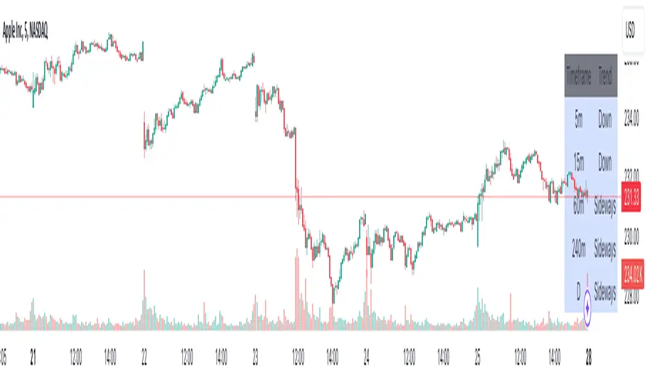 This script is designed to provide a multi-timeframe trend analysis, combining moving averages (MAs) and the Relative Strength Index (RSI) to determine market direction across different timeframes. Here's a breakdown of what the script does:
