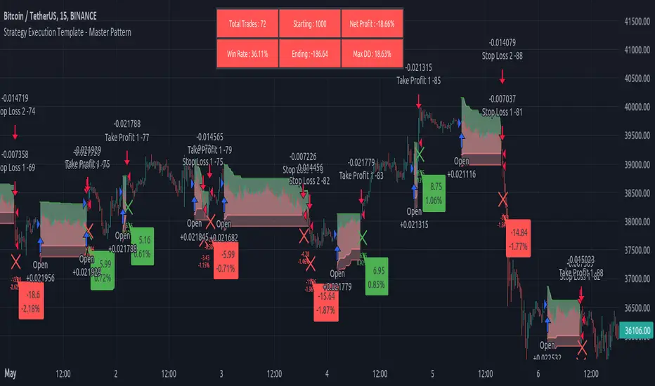 This script is a template to execute your strategy with Stop Loss and Take Profit and showing Trades.