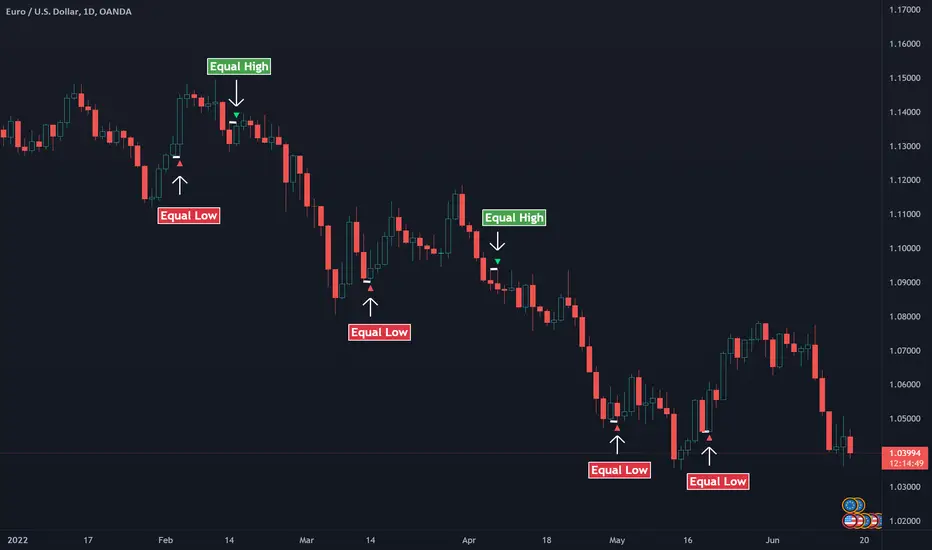 A simple indicator that detects if two candles lows or highs are equal. The pattern simply indicates the possibility of a reversal. However, many traders also use the Equal highs/lows within a broader context of market analysis to provide insights for trend traders, especially to detect pullbacks.