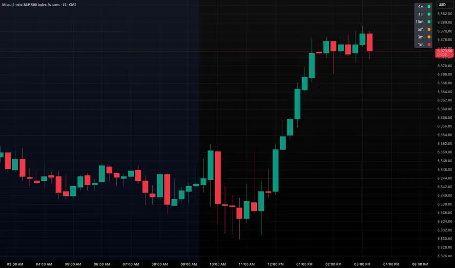 **MTF Traffic Lights (4H / 1H / 15m / 5m / 3m / 1m) - Realtime ** is a compact multi-timeframe dashboard that shows, in one glance, whether each timeframe is: