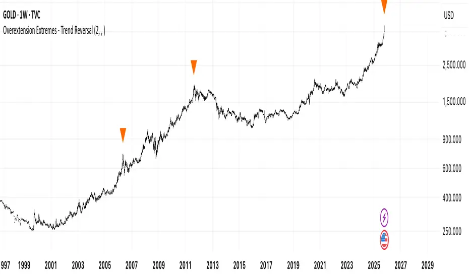 This indicator identifies potential market reversal points by measuring price distance from multiple moving averages relative to volatility (ATR). It combines five independent conditions to detect overextension: