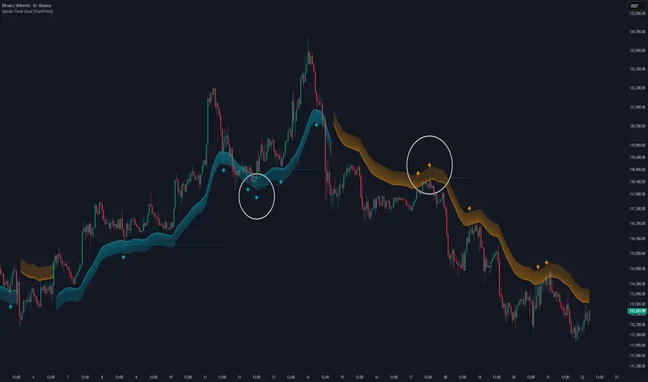 Specter Trend Cloud [ChartPrime] is a flexible moving-average–based trend tool that builds a colored “cloud” around market direction and highlights key retest opportunities. Using two adaptive MAs (short vs. long), offset by ATR for volatility adjustment, it shades the background with a gradient cloud that switches color on trend flips. When price pulls back to retest the short MA during an active trend, the script plots diamond markers and extends dotted levels from that retest price. If price later breaks through that level, the extension is terminated—giving traders a clean visual of valid vs. invalid retests.