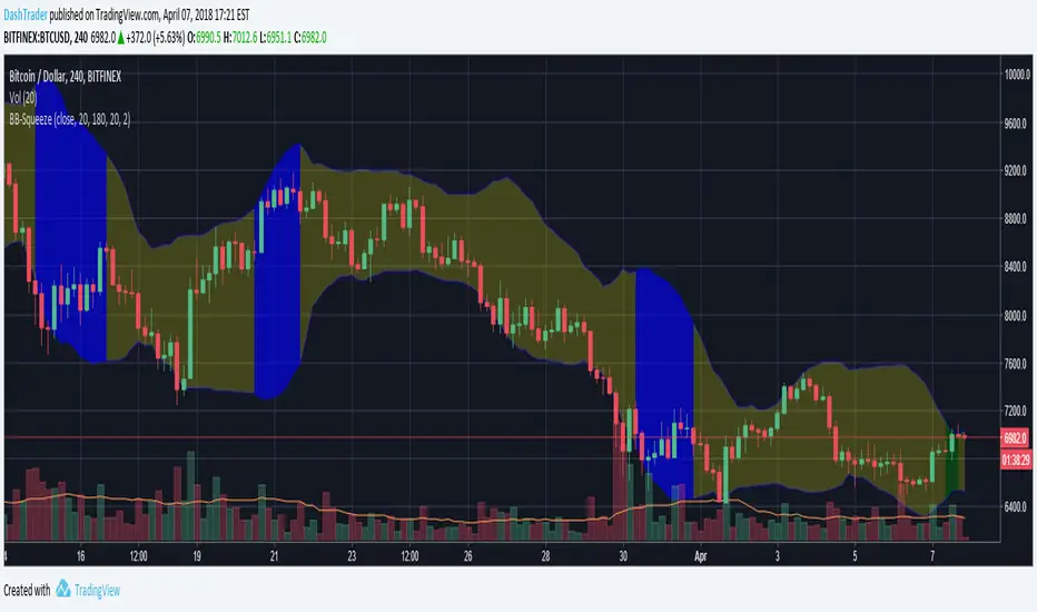 Highlights on the bands when bandwidth is below a specified number and when bands are at lowest point in last 180 periods.