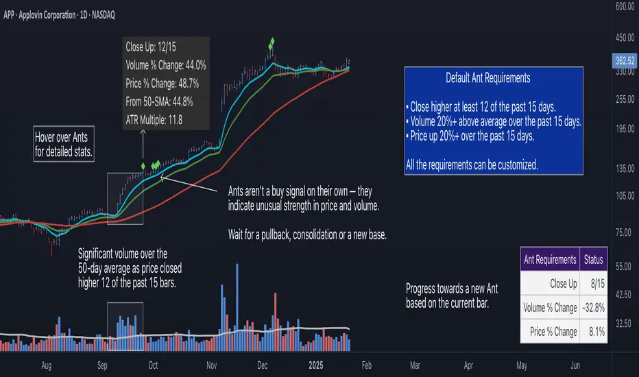 The original Ants indicator was published on TradingView in 2021, before Ant integration became available in MarketSurge — a premium charting platform developed by Investor’s Business Daily, the company founded by William O’Neil. Ants Pro is a complete rewrite designed to deliver a similar visual experience while adding extensive customization options, real-time and historical Ant statistics, unique alert features, and support for the Pine Screener to enable comprehensive stock screening.