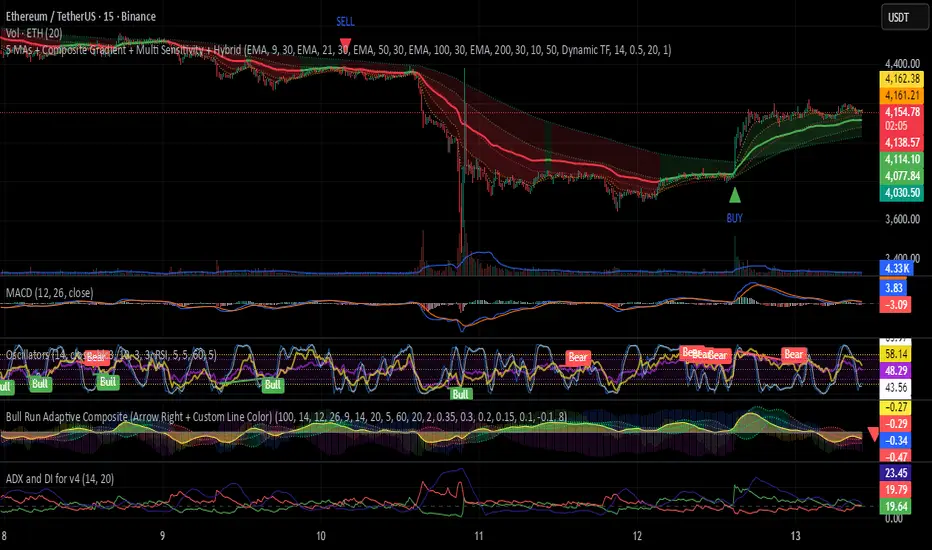 • The Composite line is dynamically colored: it shifts from red when the slope is strongly negative (downtrend) to green when the slope is strongly positive (uptrend), with smooth gradients in between.