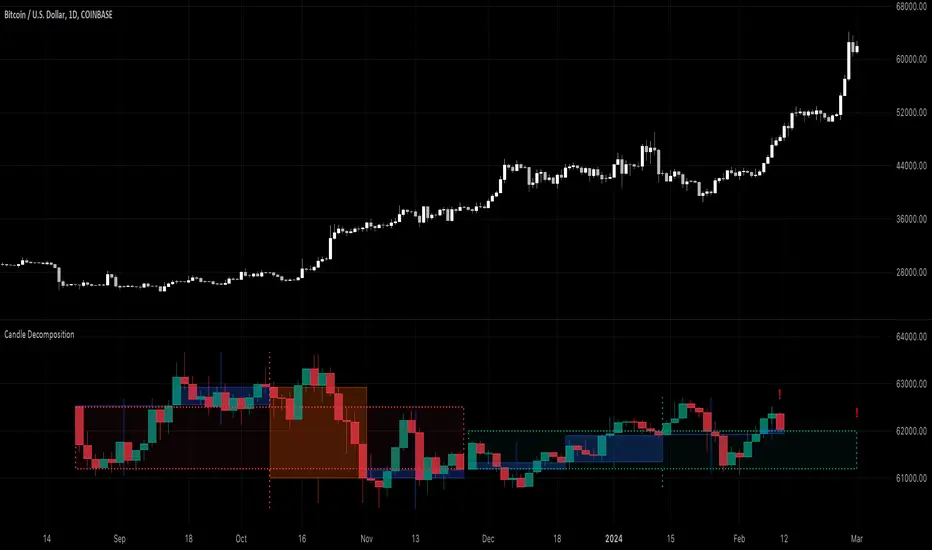 The Candle Decomposition indicator shows the last 2 candles in detail, with 2 levels of lower timeframes (LTF).