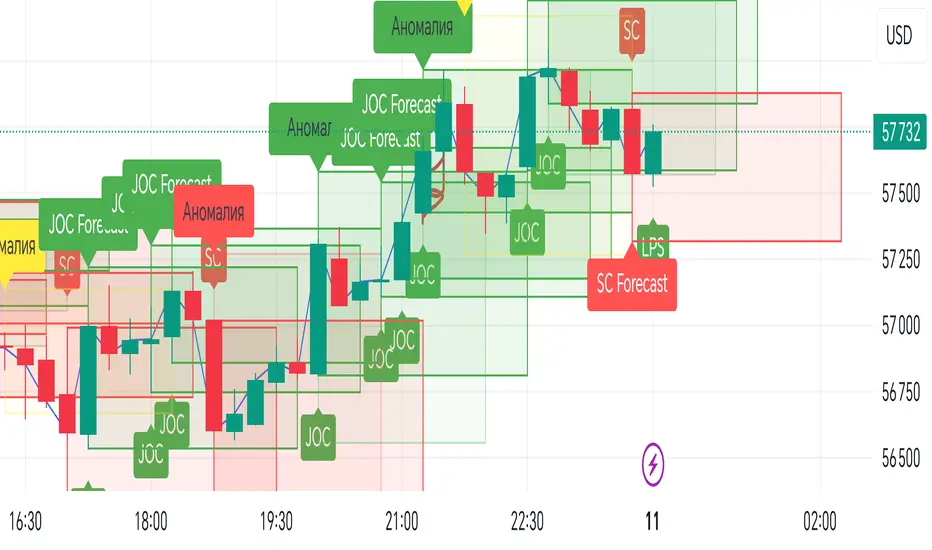 - **Прогнозный бокс Selling Climax (SC)**: Показывает красный прогнозный бокс при обнаружении сигнала SC, проецируя потенциальное медвежье движение.