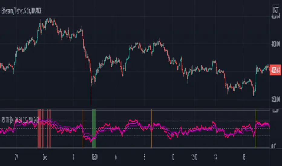 When all 3 additional RSI are at extreme levels (overbought/sold) or crossing the neutral line (50%) at the same moment, background chart color will change accordingly.