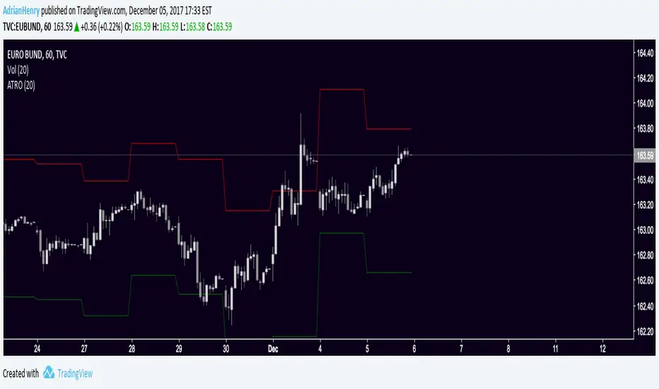 Plots the upper and lower average true range away from the previous days close on all time frames.