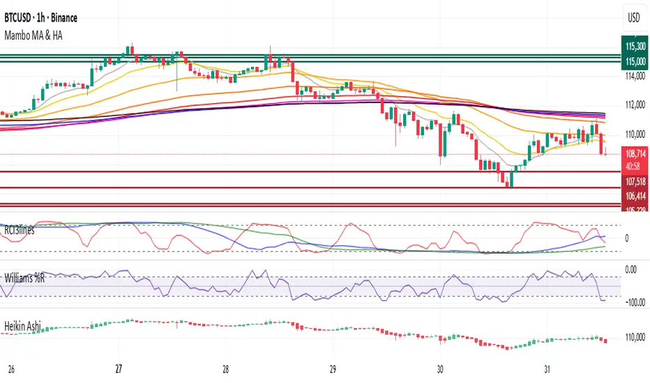 Array of 8 MAs and Heikin Ashi candle color circle plot above and below candle.