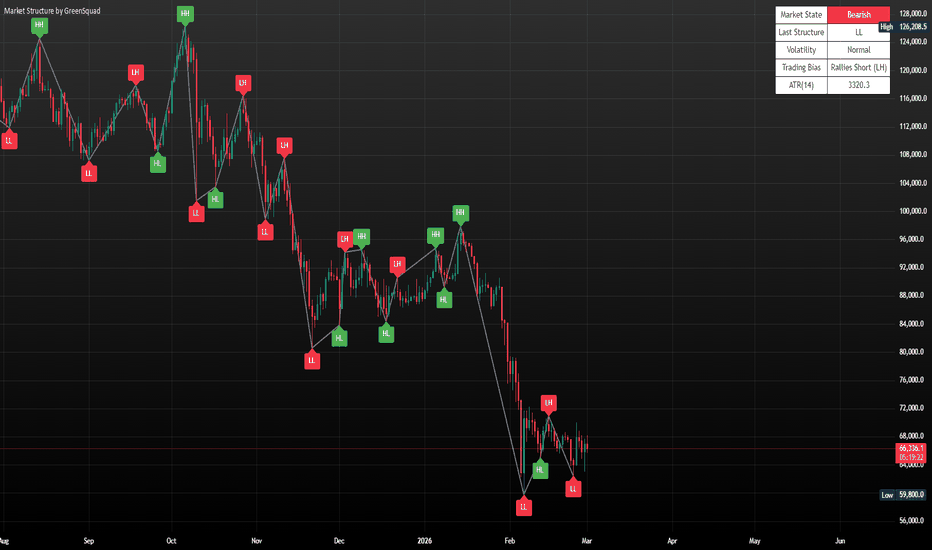 market state, last structural event, volatility regime, and statistically favorable trading bias (pullbacks in trend, reversals in transition).