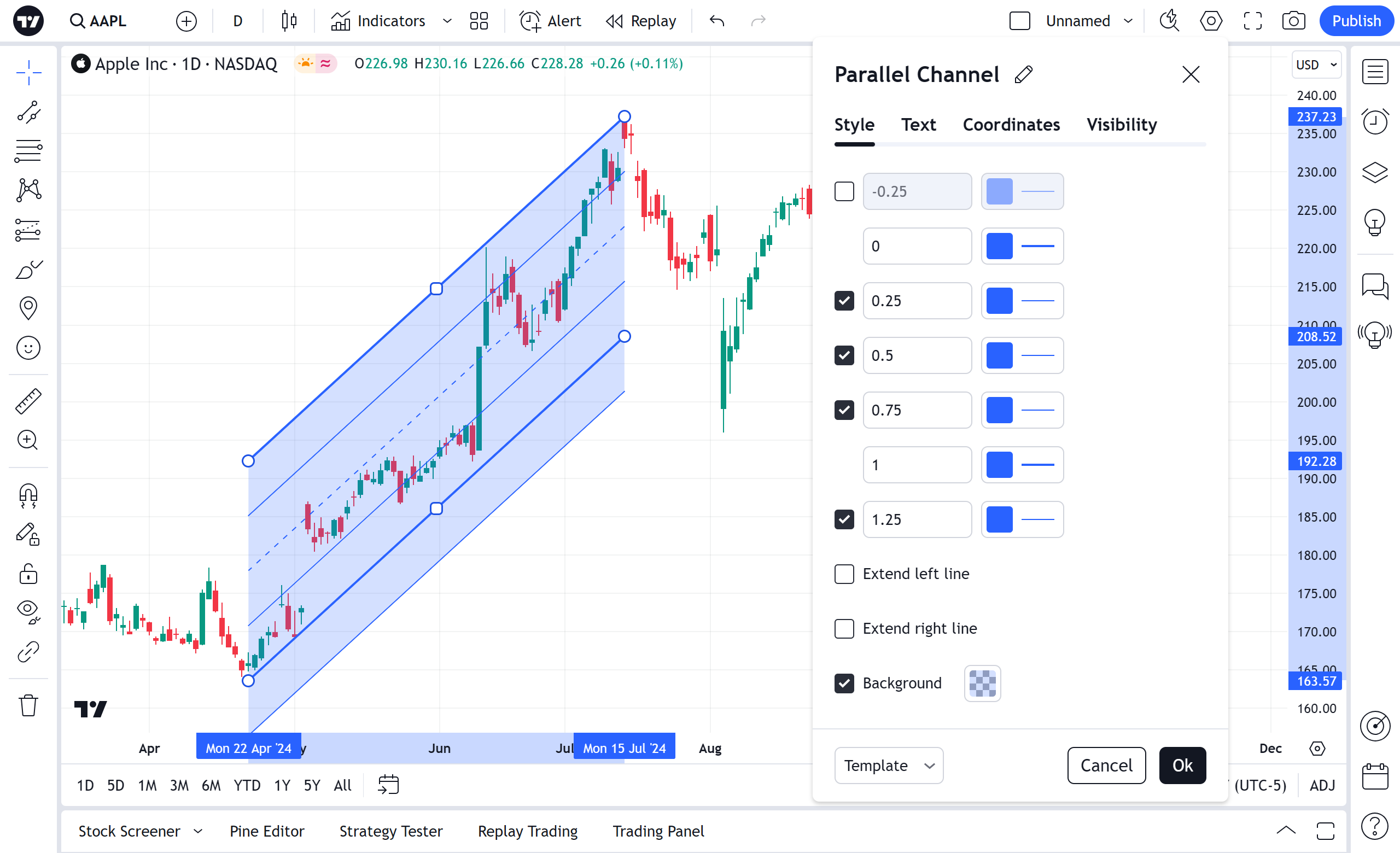 平行チャネルのチャネルラインの位置を価格で正確に指定できます。