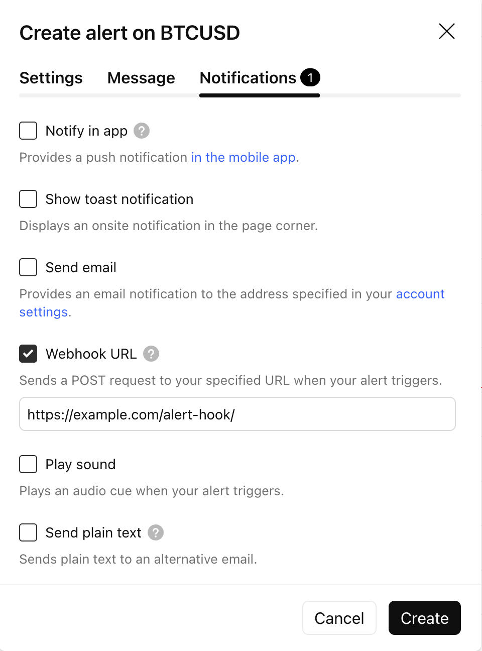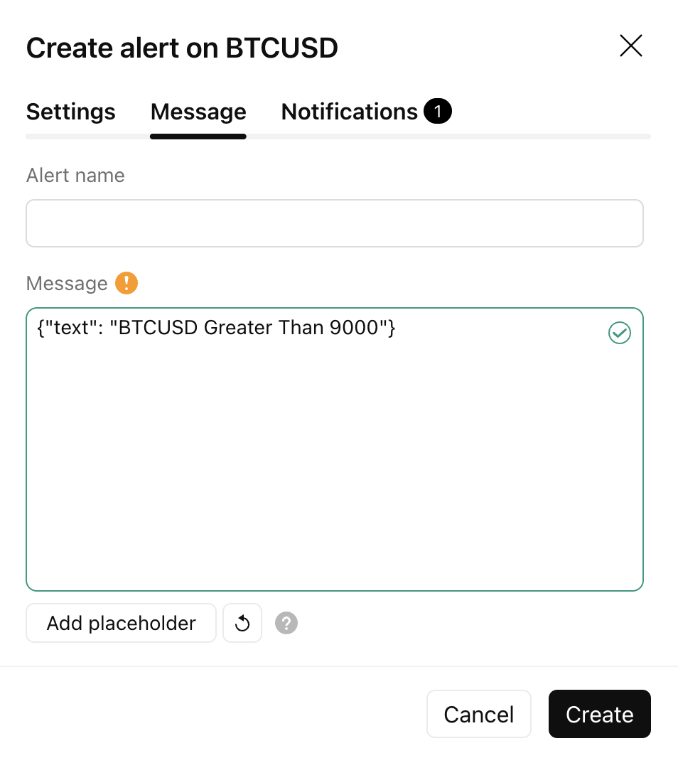 curl -H 'Content-Type: text/plain; charset=utf-8' -d 'BTCUSDが9000を超えました' -X POST https://webhook.site/testデータ保護のため、Webhookアラートは2段階認証が有効な場合にのみ使用が許可されます。