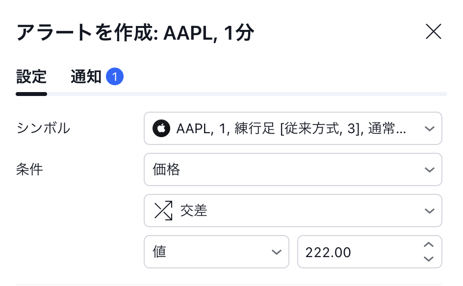 - アラートには1つのシンボルと1つの価格の値だけが使用されていること(「バー」、「練行足」、「ポイント&フィギュア」といったチャートの種類は問いません)