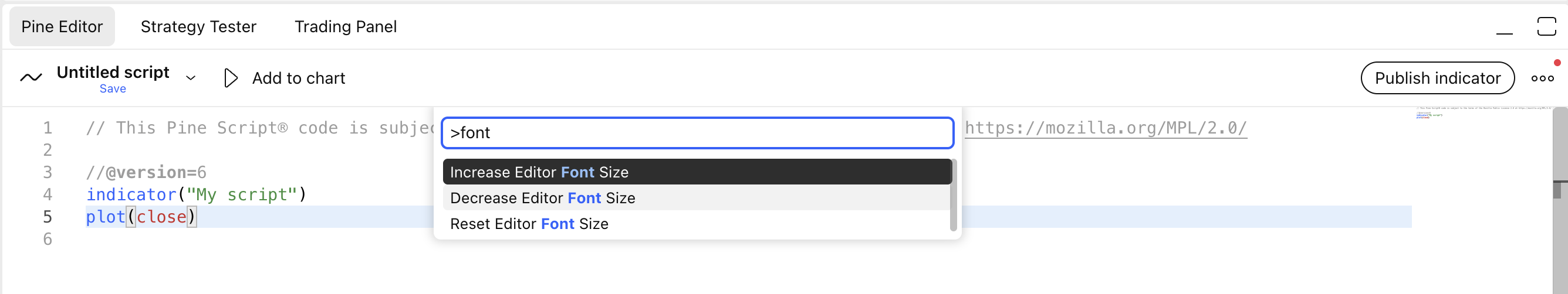 たとえば、コマンドパレットのEditor Font Zoom In/Out/Reset機能を使うと、コード内で使われるフォントのサイズを変更できます: