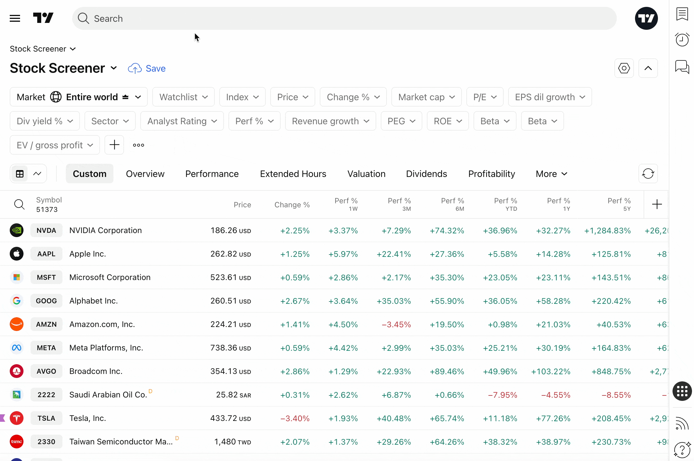 デフォルトでは、時価総額でソートされたお住まいの地域の市場が表示されます。株式スクリーナーの主な機能の一つは、複数のスクリーンを作成して保存し、後で分析に活用できる点です。あるいは、厳選したフィルターのセットが事前に設定された人気のスクリーンを使用し、興味のある企業を見つけることもできます。利用するには、左上の現在のスクリーン名をクリックして →「スクリーンを開く…」を選択してください。