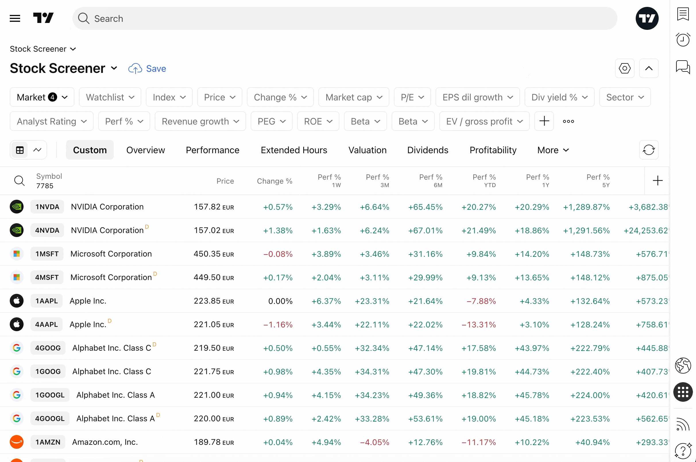 右側にはスクリーナーの設定があります。シンボルのロゴ、詳細、種類、通貨のオン/オフや、更新頻度を選択できます。また、時価総額や希薄化EPSなどの財務指標の通貨(USD、EUR、JPY、GBPなど)も選べます。