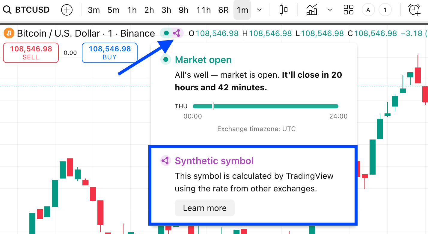 1. TradingViewで計算された合成シンボルは、ペーパートレードでの取引ができません。これらのティッカーには、市場ステータスの横に紫色のラベルが表示されます。