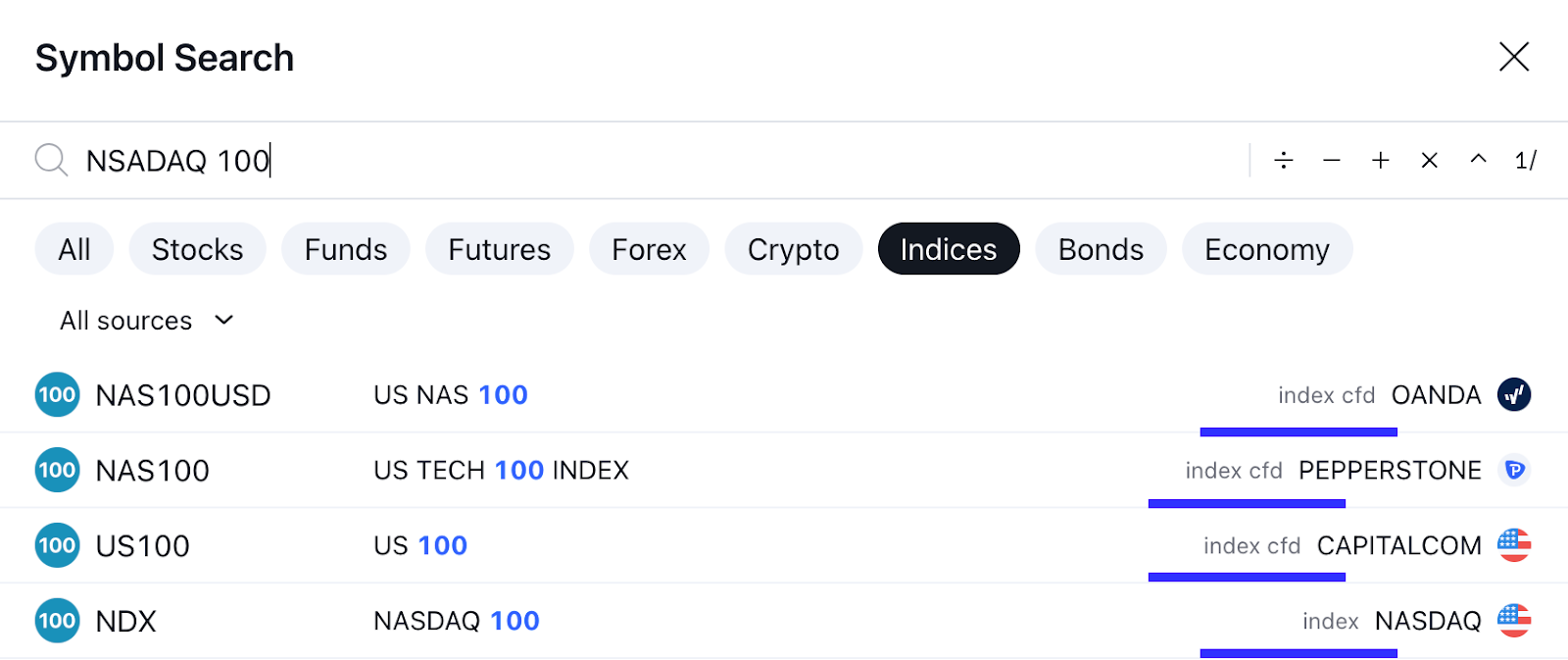 2. また、指数にも「トレードできないシンボル」の通知が表示されます。これらのシンボルは一般的に取引がサポートされておらず、例えばNASDAQ:NDXなどが該当します。