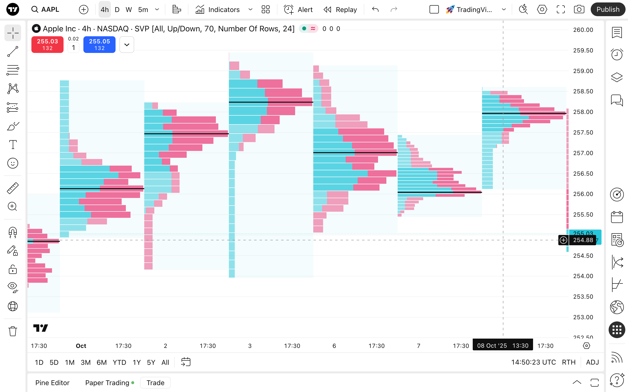 SVPは最高出来高を記録したポイントオブコントロール(POC)やバリューエリアハイ/ロー(VAH/VAL)の境界線など、重要な価格水準を強調表示します。取引日全体や個別セッション(プレマーケット、マーケット、アフターマーケット)の分析が可能で、実際の出来高分布に基づいて市場によって受け入れられた価格範囲を特定したり、サポート/レジスタンスゾーンを見極めることができます。