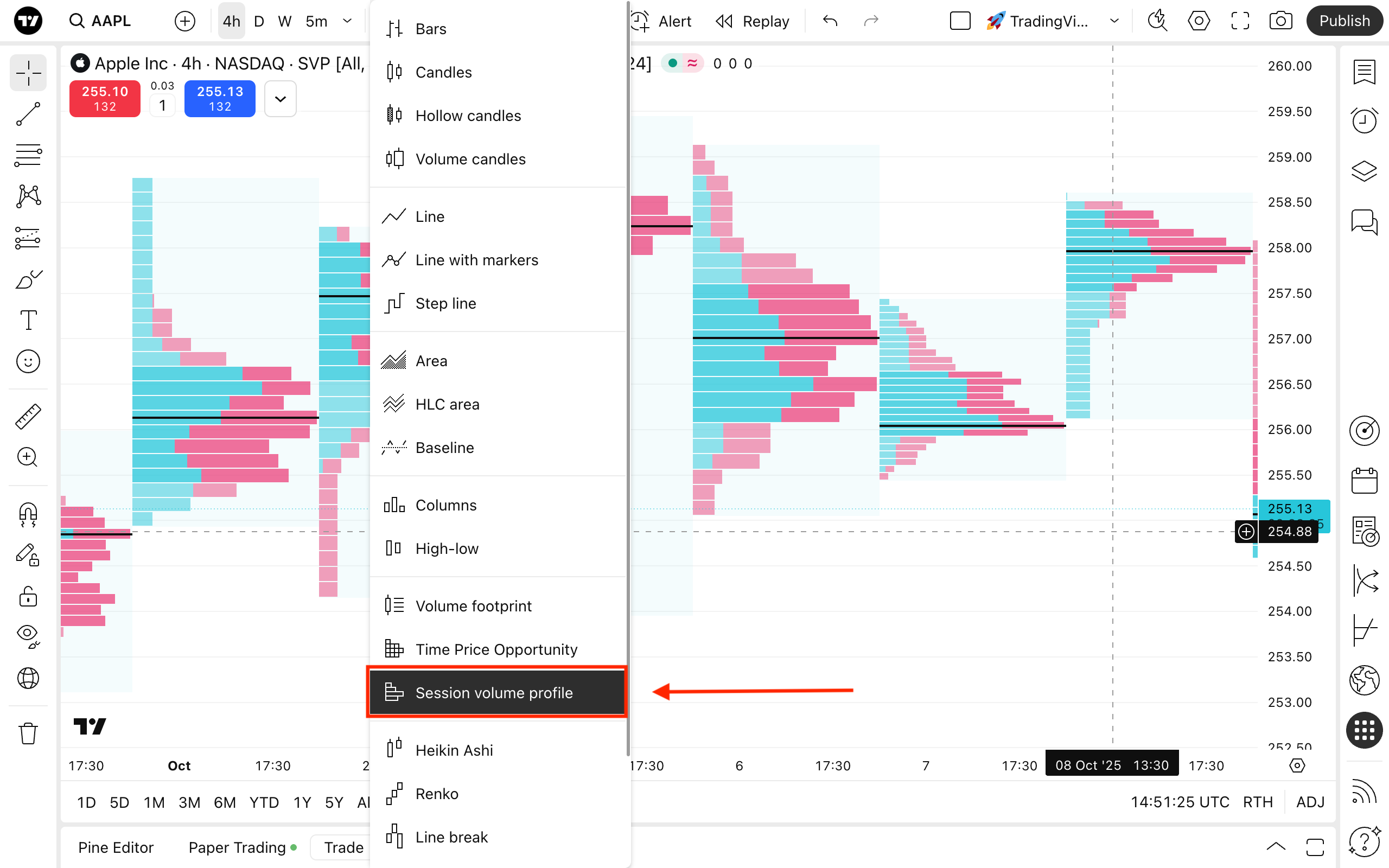 スーパーチャートにアクセスしたら、画面上部のツールバーからチャートタイプ(バーのスタイル)メニューを開いて「SVP (セッション出来高プロファイル)」を選択します。