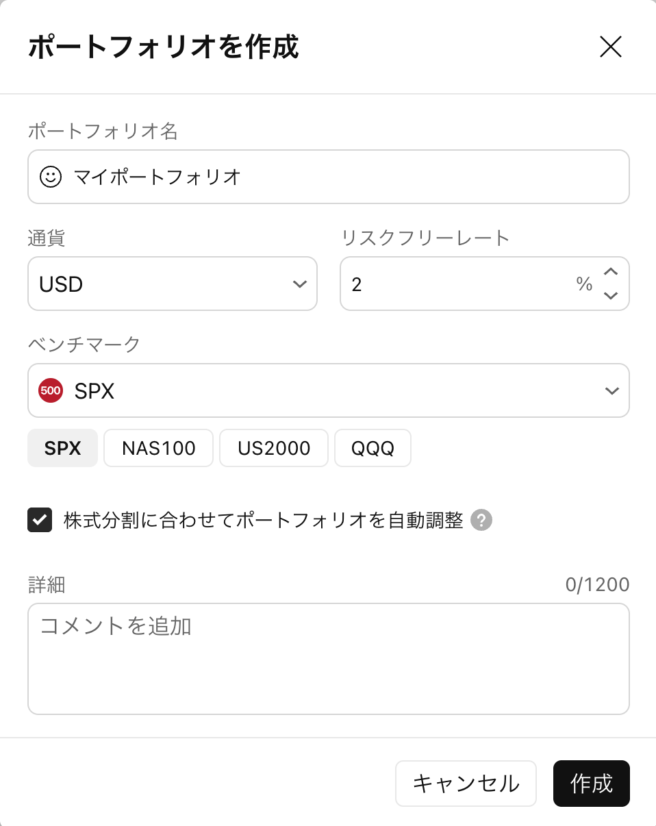 クリックすると、新規ポートフォリオを作成するポップアップ画面が表示されます。