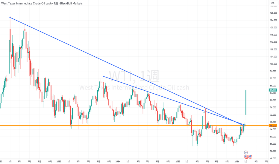 (WTI)原油2022年3月に付けた高値を起点に、約3年間続いた明確なダウントレンドをついに上抜けたWTI